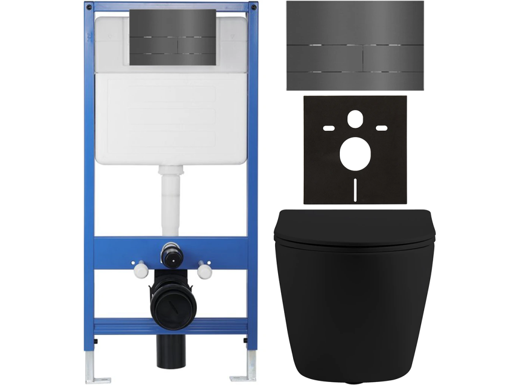 CERANO - Kompletní podomítkový WC set Lite/Cesso - černá matná - WC tlačítko Line, tmavě šedá - předstěnová instalace - 49x36 cm