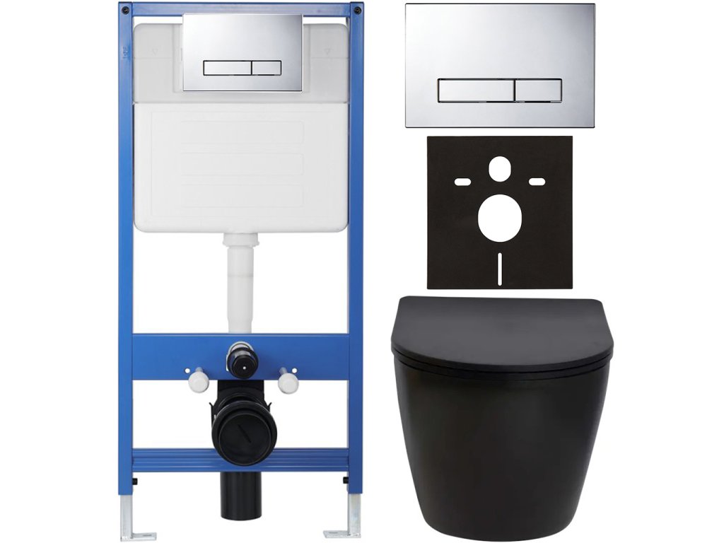 CERANO - Kompletní podomítkový WC set Lite/Verde - černá matná - WC tlačítko Slim, chrom - předstěnová instalace/sádrokarton - 49x36 cm