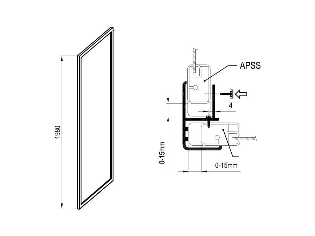 Výrobek se skládá z jednoho pevného dílu a není určen k samostatnému použití. Součástí balení je rohový spojovací profil pro připojení ke sprchovým dveřím či sprchovému koutu. K uchycení na stěnu se použije ustavovací profil, který obsahuje balení sprchových dveří či koutu. Případné nerovnosti stavebního otvoru lze kompenzovat pomocí nastavovacích profilů NPS. Pevná stěna APSS se dá kombinovat se sprchovými dveřmi ASDP3 (s výškou 1980 mm) k vytvoření sprchového koutu tvaru „L“. Pomocí dvou pevných stěn APSS a sprchových dveří ASDP3 vytvoříte sprchový kout ve tvaru „U“. Ostatní rozměry a varianty pevné stěny řešíme na míru.