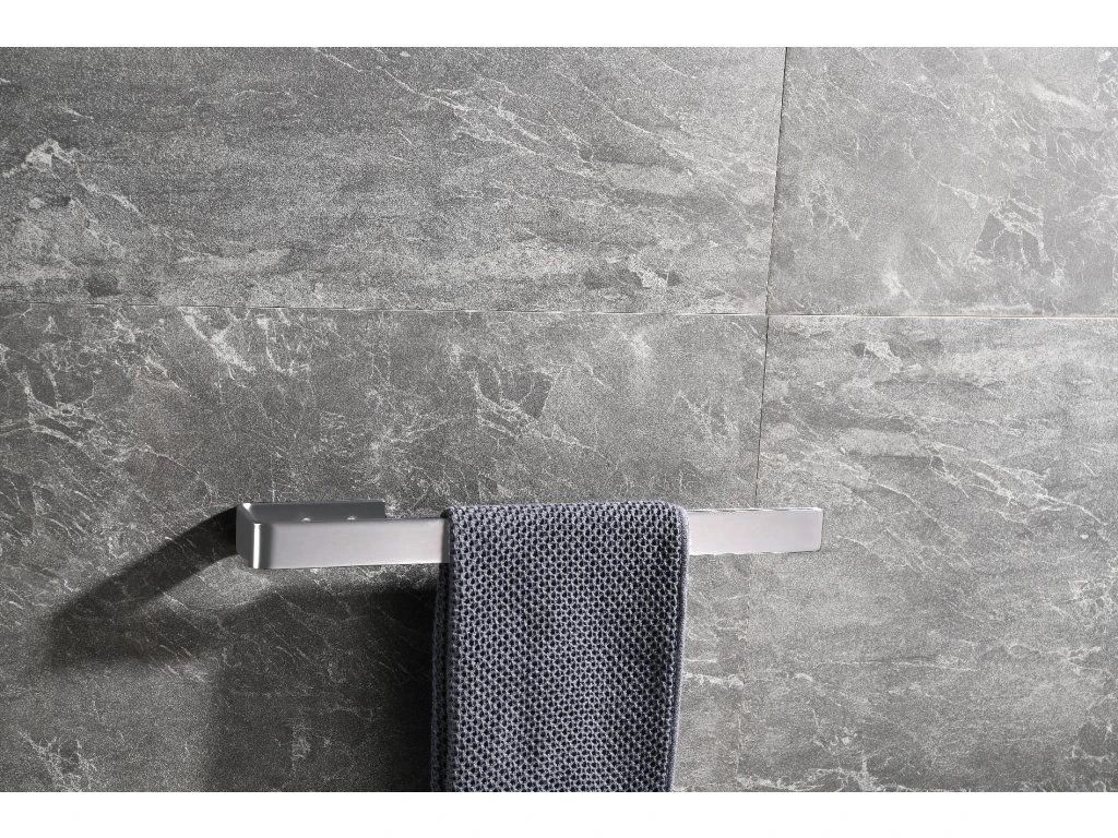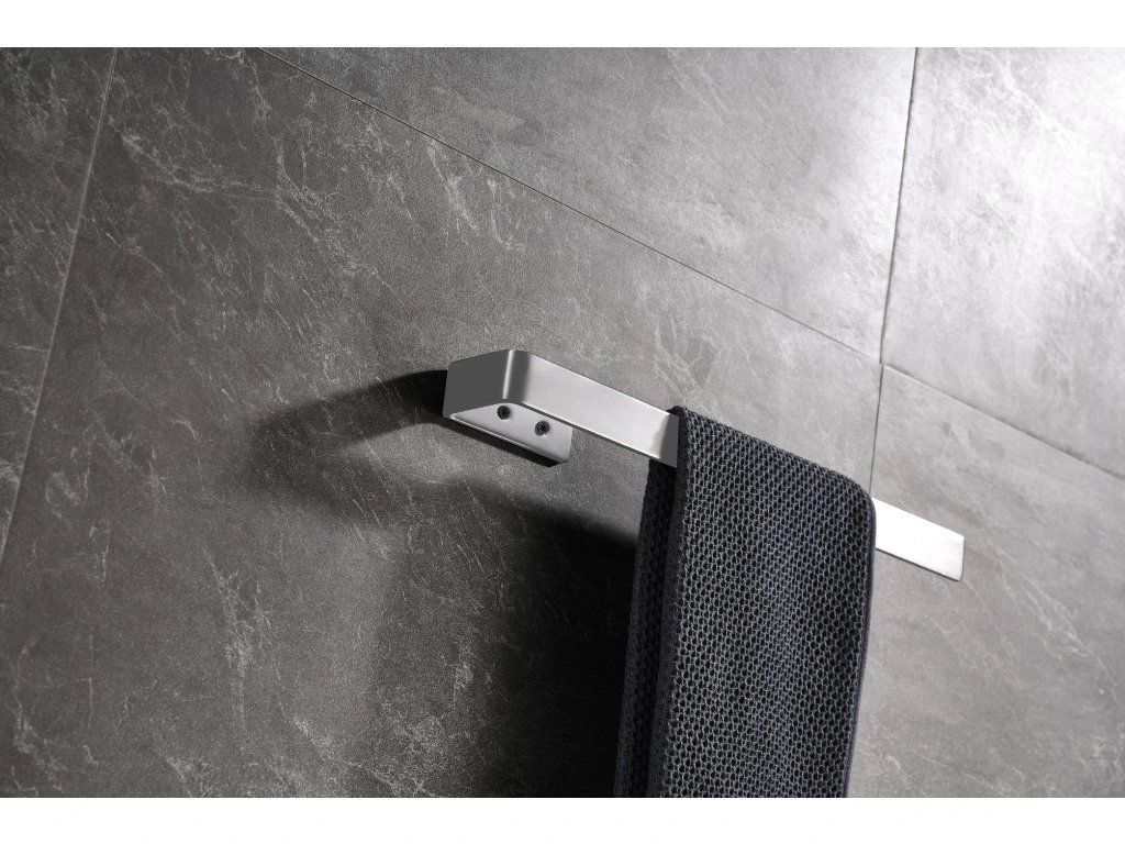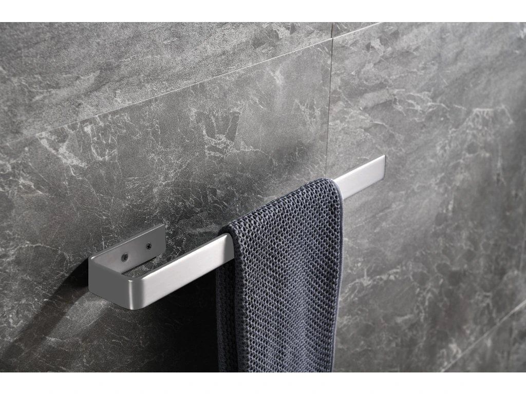 Přední strana disponuje dlouhým ramenem, které slouží k zavěšování ručníků. Toto rameno je pevně upevněno ke stěně pomocí dvou malých montážních vrutů s hmoždinkami, které jsou diskrétně umístěny na konci kratšího ramene. Tento způsob montáže zajišťuje vyšší pevnost a nosnost celého držáku. Montážní sada je součástí balení.