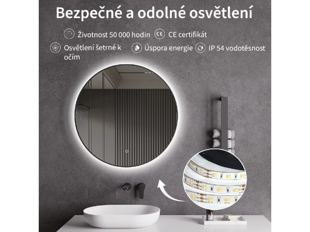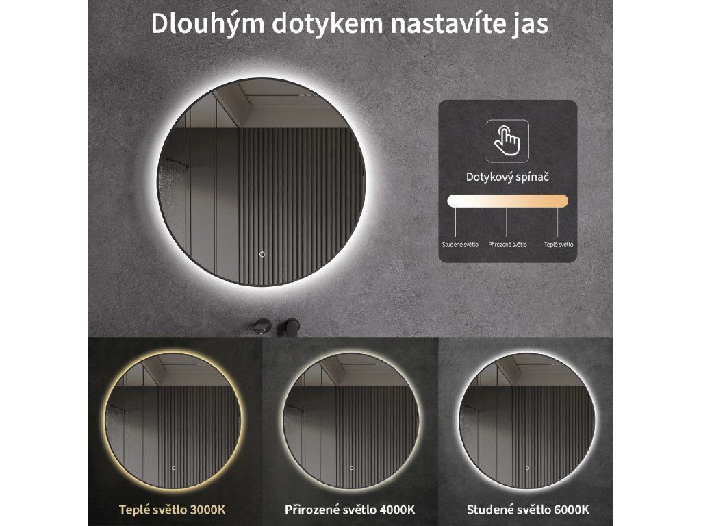 Zrcadlo je vybaveno LED osvětlením s nastavitelnou barvou světla – od 3000 K (teplá) do 6000 K (Neutrální). Přepínání barev jednoduše ovládáte dotykovým tlačítkem na ploše zrcadla. Poskytuje intenzivní a jasné světlo pro detailní péči i příjemné, jemné osvětlení pro relaxaci. Díky širokému rozsahu teploty barev tak snadno přizpůsobíte atmosféru aktuální potřebě.