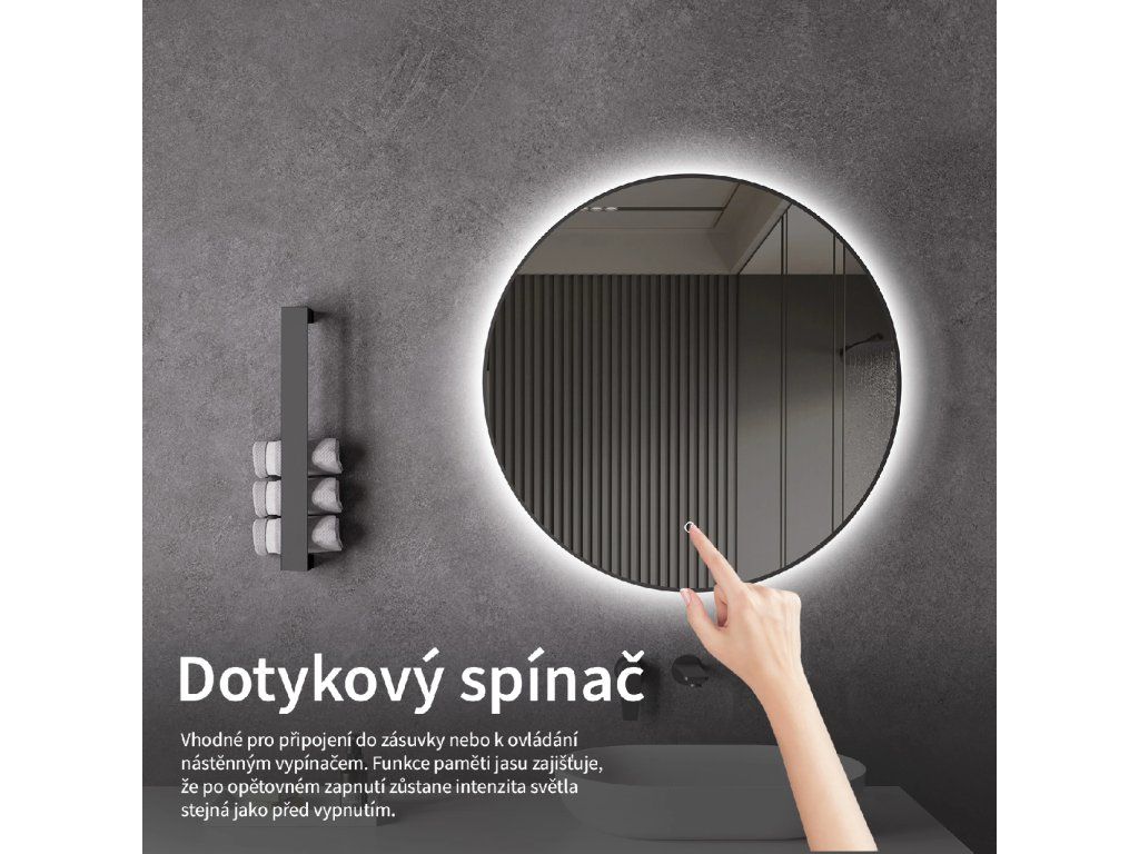 Osvětlení zrcadla lze snadno a pohodlně zapnout dotykem přepínače na panelu zrcadla. Umožňuje rychlé nastavení osvětlení bez nutnosti sahat po vzdálenějším tradičním vypínači.