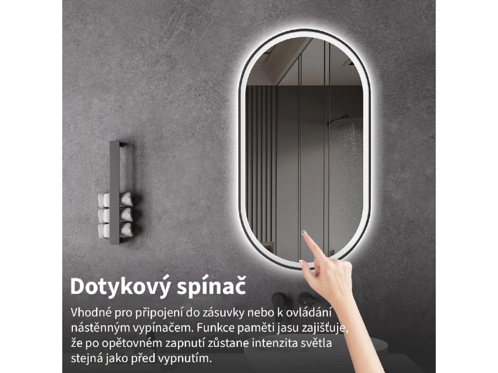 Osvětlení zrcadla lze snadno a pohodlně zapnout dotykem přepínače na panelu zrcadla. Umožňuje rychlé nastavení osvětlení bez nutnosti sahat po vzdálenějším tradičním vypínači.