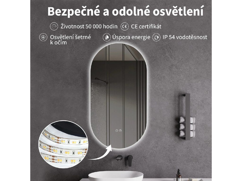 Zrcadlo je vybaveno LED osvětlením s nastavitelnou barvou světla – od 2800K (teplá) do 6000K (Neutrální). Poskytuje intenzivní a jasné osvětlení pro detailní péči i příjemné a jemné světlo pro relaxaci. Díky širokému rozsahu teploty barev lze přizpůsobit atmosféru dle potřeby.