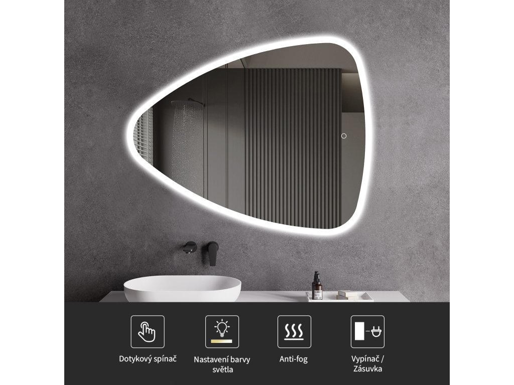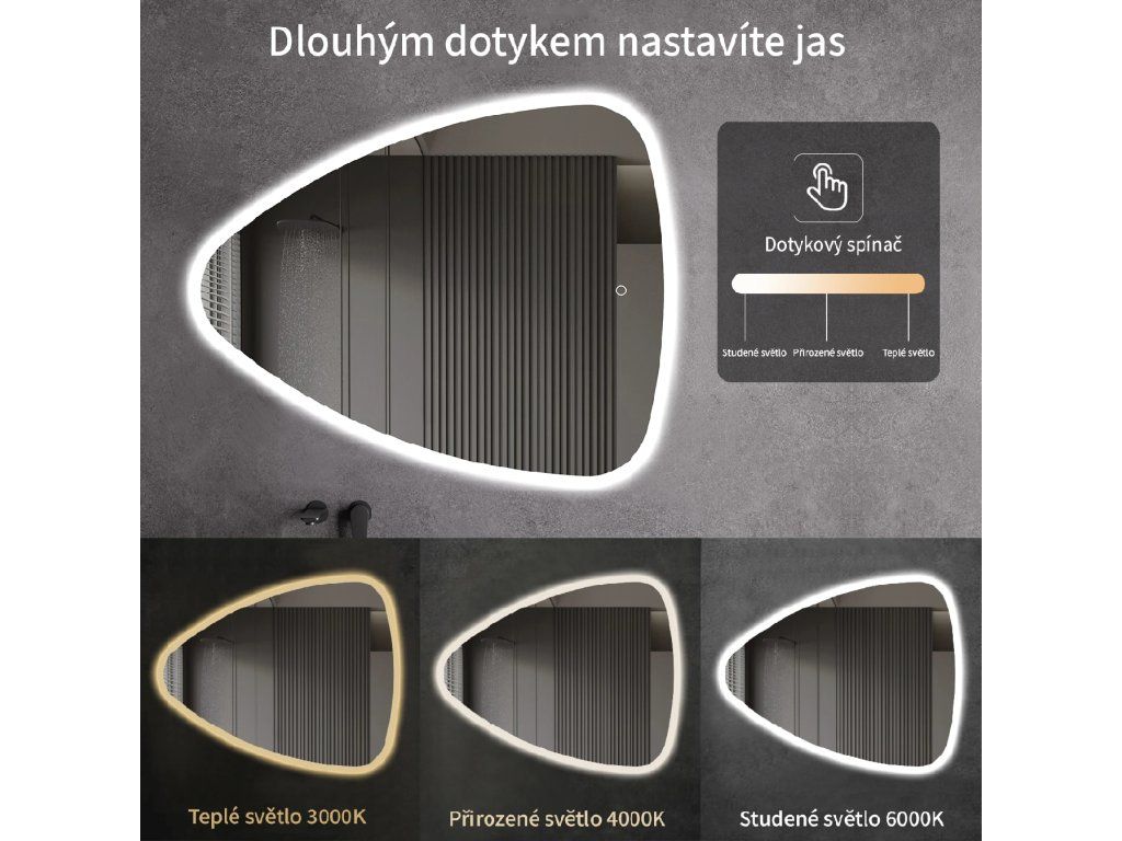 Zrcadlo je vybaveno LED osvětlením s nastavitelnou barvou světla – od 3000 K (teplá) do 6000 K (Neutrální). Přepínání barev jednoduše ovládáte dotykovým tlačítkem na ploše zrcadla. Poskytuje intenzivní a jasné světlo pro detailní péči i příjemné, jemné osvětlení pro relaxaci. Díky širokému rozsahu teploty barev tak snadno přizpůsobíte atmosféru aktuální potřebě.