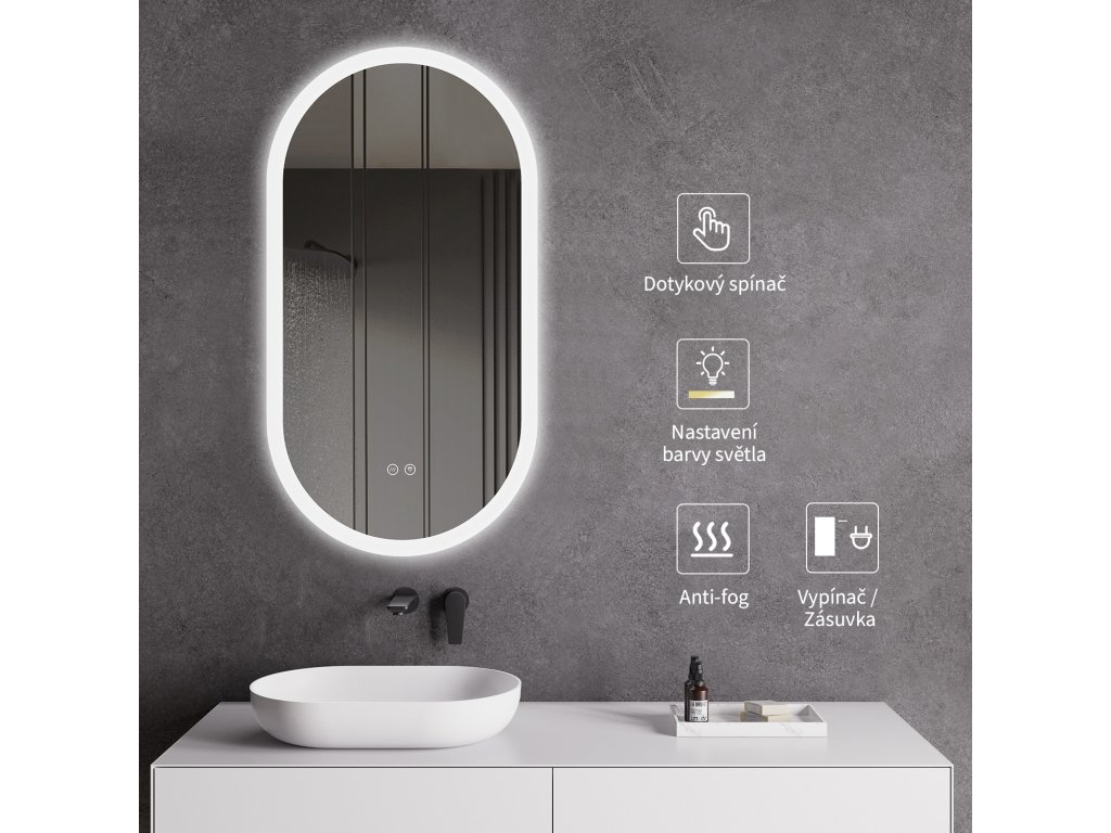 Zrcadlo je vybaveno LED osvětlením s nastavitelnou barvou světla – od 2800K (teplá) do 6000K (Neutrální). Poskytuje intenzivní a jasné osvětlení pro detailní péči i příjemné a jemné světlo pro relaxaci. Díky širokému rozsahu teploty barev lze přizpůsobit atmosféru dle potřeby.