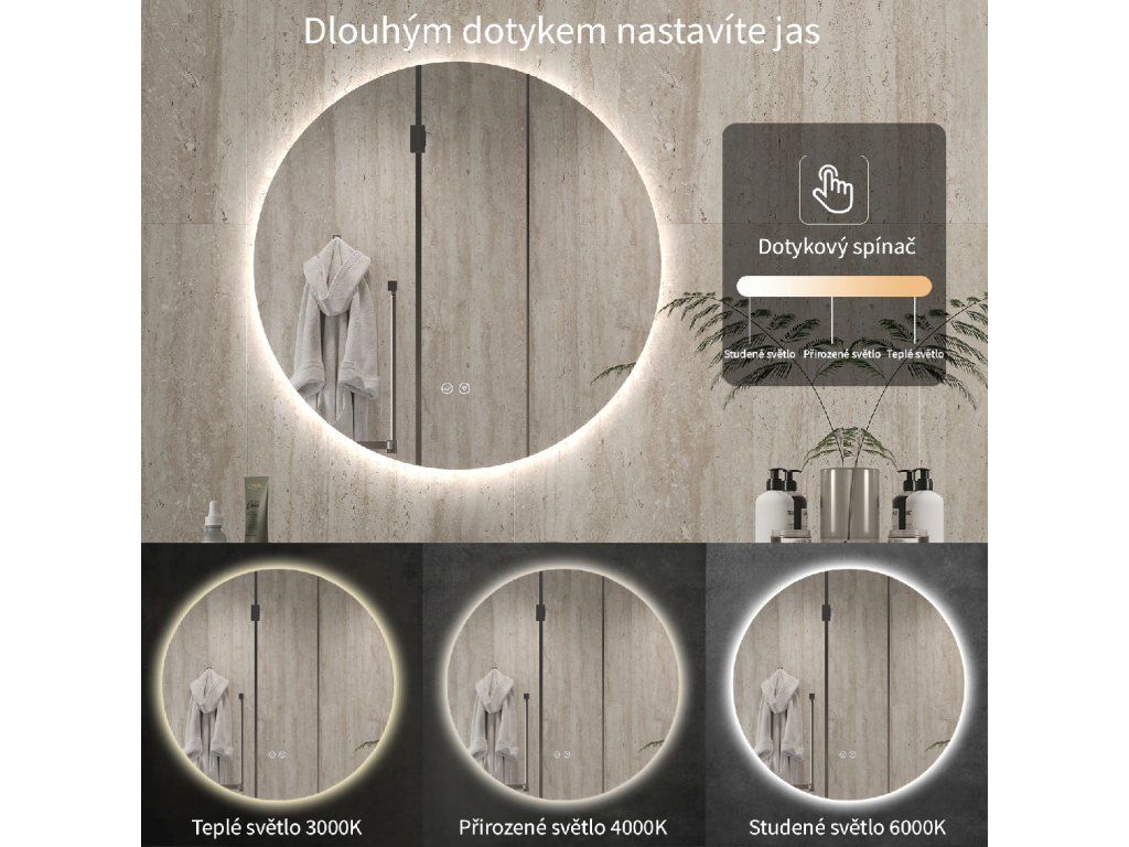 Zrcadlo je vybaveno LED osvětlením s nastavitelnou barvou světla – od 3000 K (teplá) do 6000 K (Neutrální). Přepínání barev jednoduše ovládáte dotykovým tlačítkem na ploše zrcadla. Poskytuje intenzivní a jasné světlo pro detailní péči i příjemné, jemné osvětlení pro relaxaci. Díky širokému rozsahu teploty barev tak snadno přizpůsobíte atmosféru aktuální potřebě.
