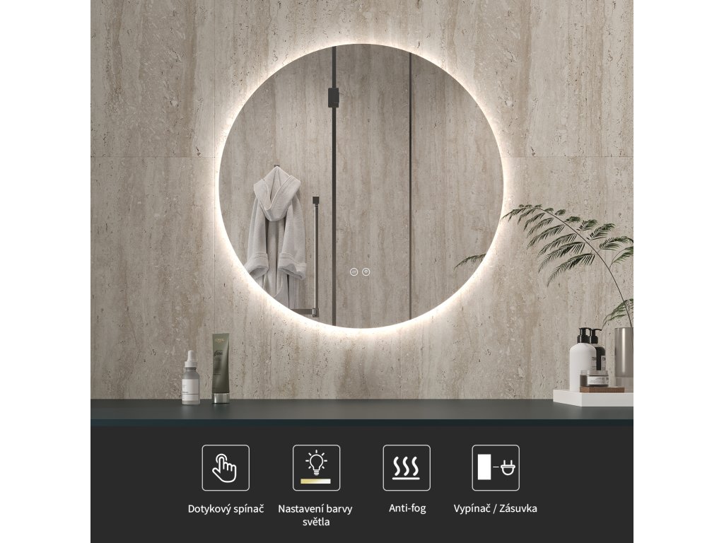 Zrcadlo je vybaveno LED osvětlením s nastavitelnou barvou světla – od 3000 K (teplá) do 6000 K (Neutrální). Přepínání barev jednoduše ovládáte dotykovým tlačítkem na ploše zrcadla. Poskytuje intenzivní a jasné světlo pro detailní péči i příjemné, jemné osvětlení pro relaxaci. Díky širokému rozsahu teploty barev tak snadno přizpůsobíte atmosféru aktuální potřebě.