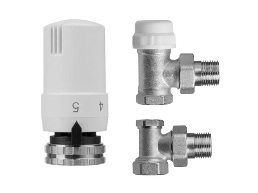 Termostatická sada ventilů určena pro středové připojení. Obsahuje termostatický ventil s přednastavenou hodnotou.