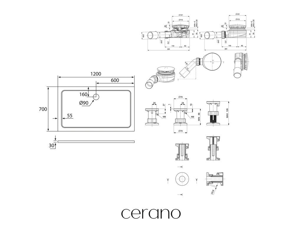 CERANO - Sprchový vaničkový set Piato - litý mramor - bílá lesklá - 120x70 cm + nožičky + sifon sprch.vaničky