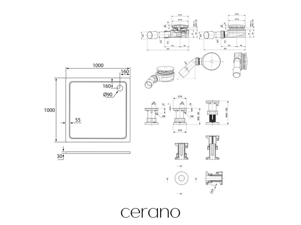 CERANO - Sprchový vaničkový set Piato - litý mramor - bílá lesklá - 100x100 cm + nožičky + sifon sprch.vaničky