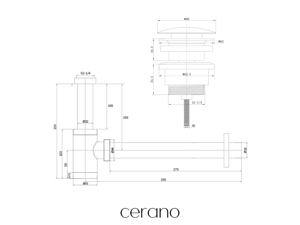 CERANO - Sifon umyvadlový - mosaz - DN32 mm - s výpustí click-clack - bez přepadu - bílá