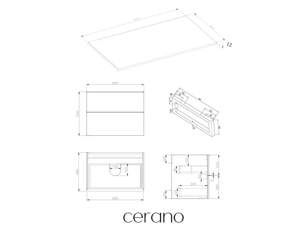 CERANO - Deska pod umyvadlo z litého mramoru Elanys - 140x46,5x1,2 cm - skříňka Velora 69 cm - černá matná, černá úchytka - konzole černá
