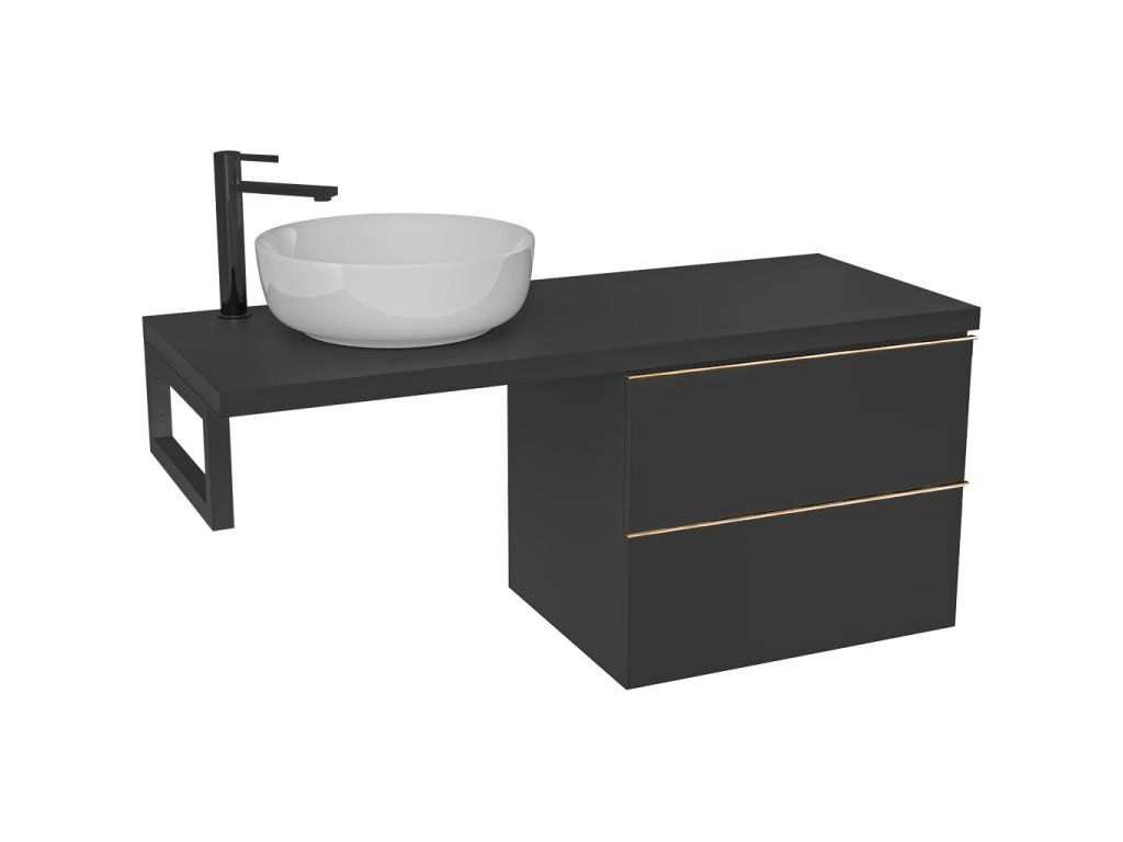 CERANO - Deska pod umyvadlo Navira Pro - 141x46,5x3,6 cm - skříňka Velora 69 cm - černá matná, zlatá úchytka - konzole černá