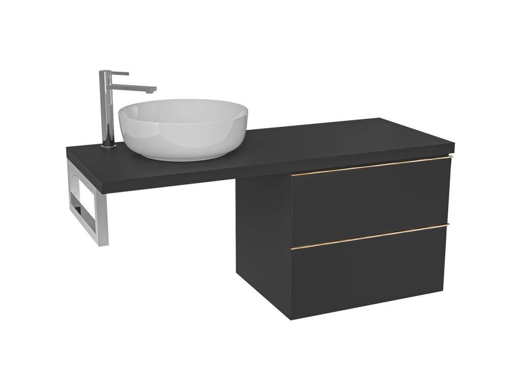 CERANO - Deska pod umyvadlo Navira Pro - 161x46,5x3,6 cm - skříňka Velora 79 cm - černá matná, zlatá úchytka - konzole chrom