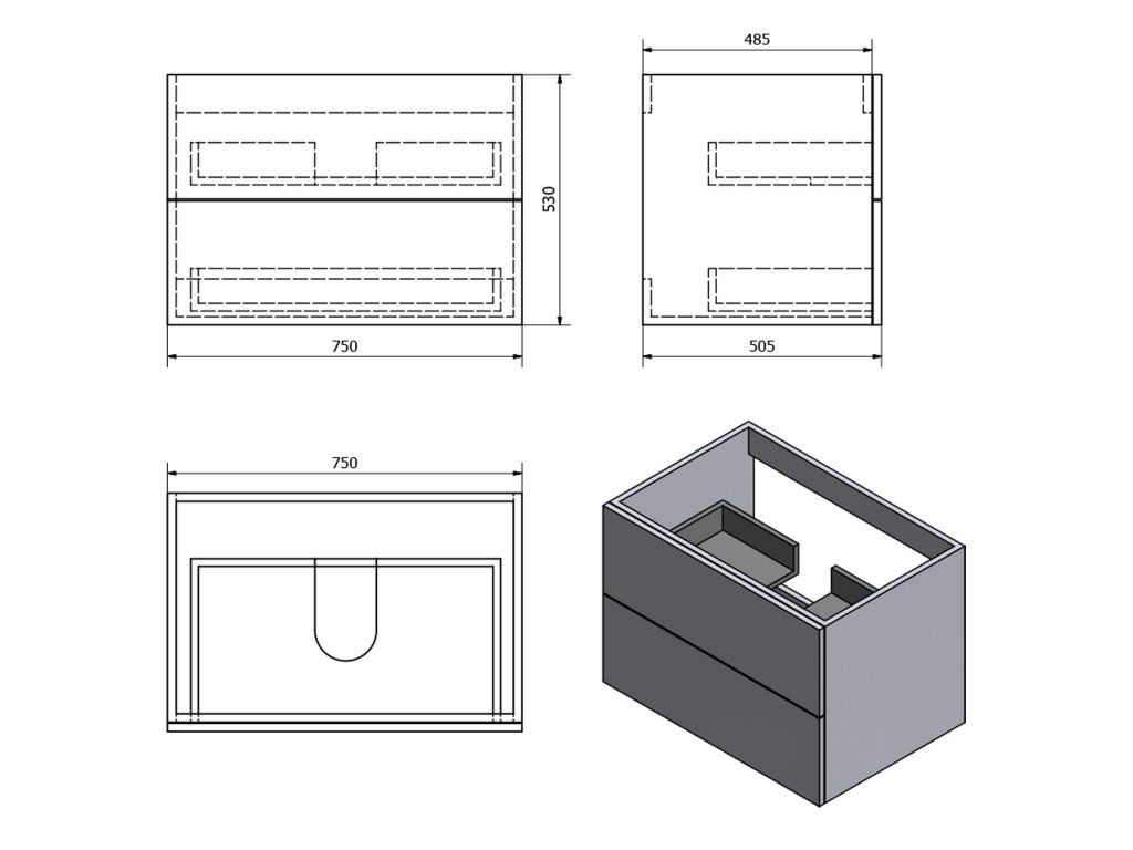- 2x zásuvka, horní s výřezem pro sifon v ose skříňky.