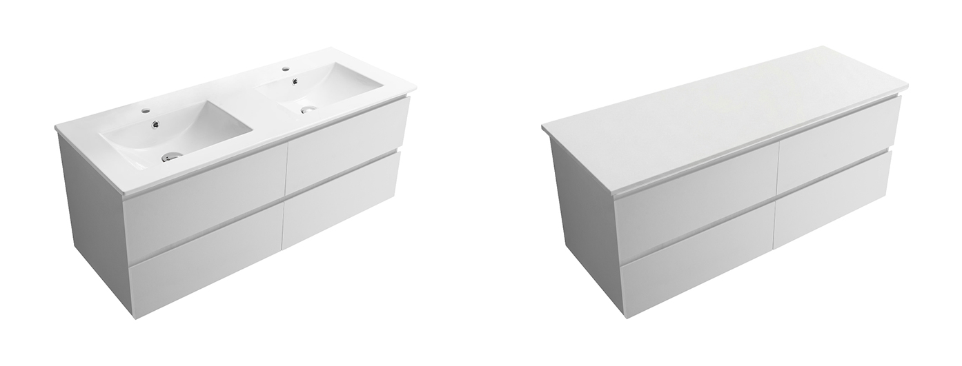 Koupelnové skříňky jsou vyrobeny z MDF lamina (středně hustá dřevovláknitá deska) s nalisovanou melaminovou fólií, která je odolná vůči vlhkosti, poškrábání, UV záření a běžným čisticím prostředkům. Povrch je hladký, tvrdý, homogenní a snadno se čistí. MDF desky se nekroutí jako masivní dřevo. Pokud dojde k mechanickému narušení laminace, samotné MDF jádro může navlhnout.