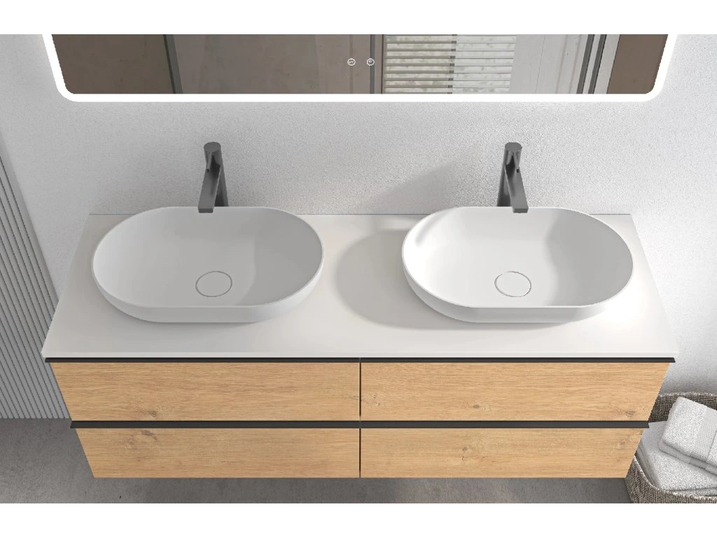CERANO - Koupelnová skříňka pod umyvadlo Velora s úchytkou/deskou z litého mramoru Elanys - 12 mm - dub medový, černá úchytka - 138x53x45,2 cm