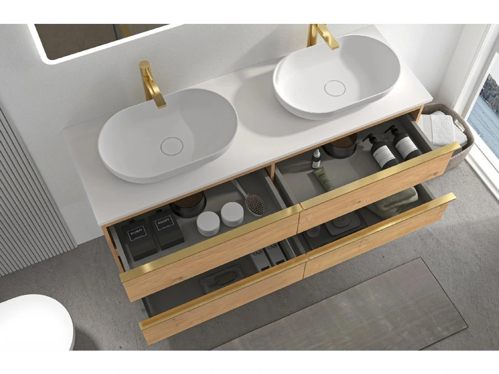 CERANO - Koupelnová skříňka pod umyvadlo Velora s úchytkou/deskou z litého mramoru Elanys - 12 mm - dub medový, zlatá úchytka - 138x53x45,2 cm
