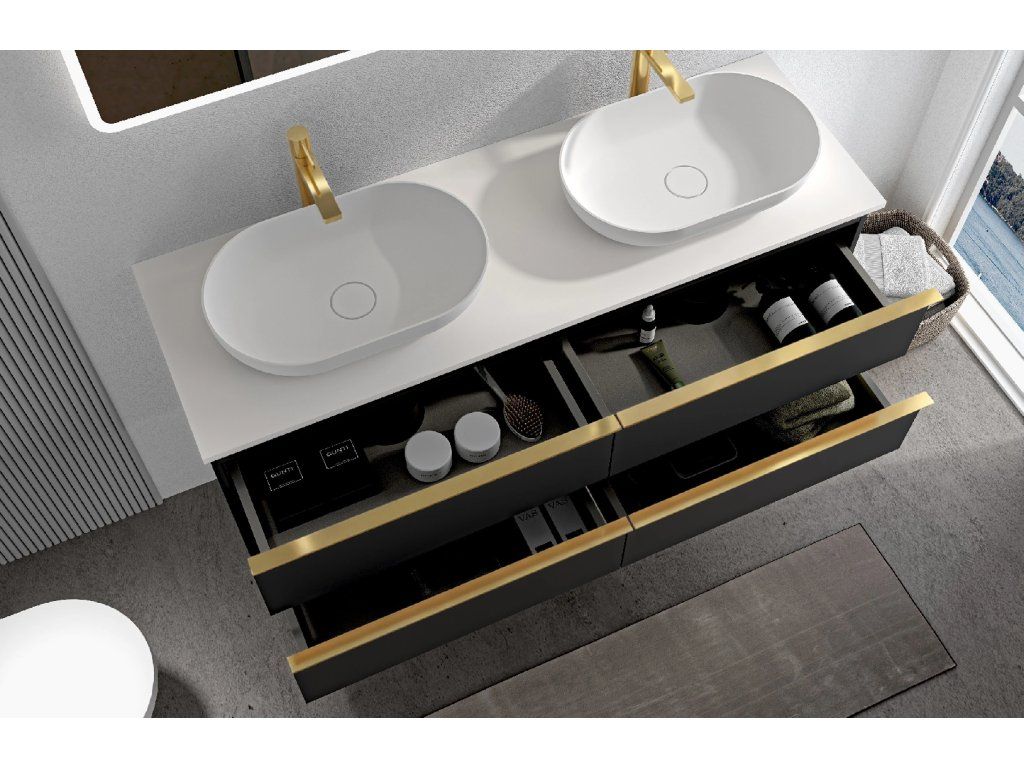 CERANO - Koupelnová skříňka Velora - černá matná, úchytka zlatá + deska z lit. mramoru Elanys - 12 mm - bílá matná - 120x54,2x46,5 cm