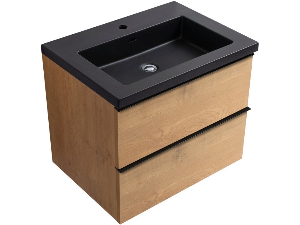 CERANO - Koupelnová skříňka Velora - černá matná - úchytka černá + keramické umyvadlo Ovo - dub medový - 59x53x46 cm