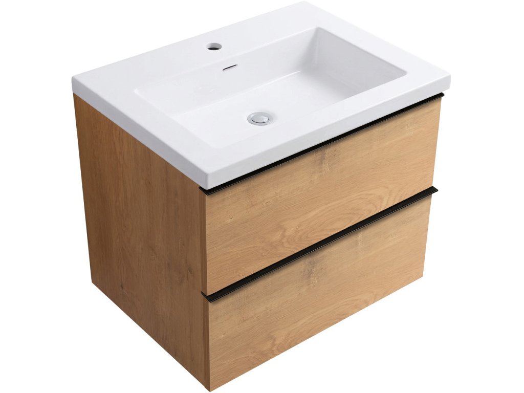 CERANO - Koupelnová skříňka Velora - bílá lesklá - úchytka černá + keramické umyvadlo Ovo - dub medový - 69x53x46 cm