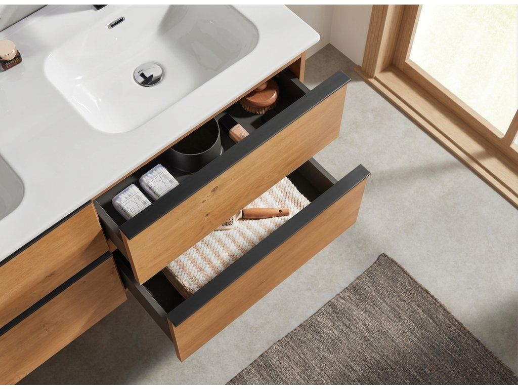 CERANO - Koupelnová skříňka Velora - dub medový, úchytka černá + keramické umyvadlo Novo - bílá lesklá - 121x54,5x46,5 cm