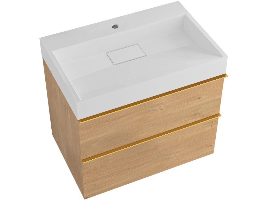 CERANO - Koupelnová skříňka Velora - dub medový - úchytka zlatá + umyvadlo s otvorem pro baterii z litého mramoru Vita - bílá matná - 70x53x46 cm