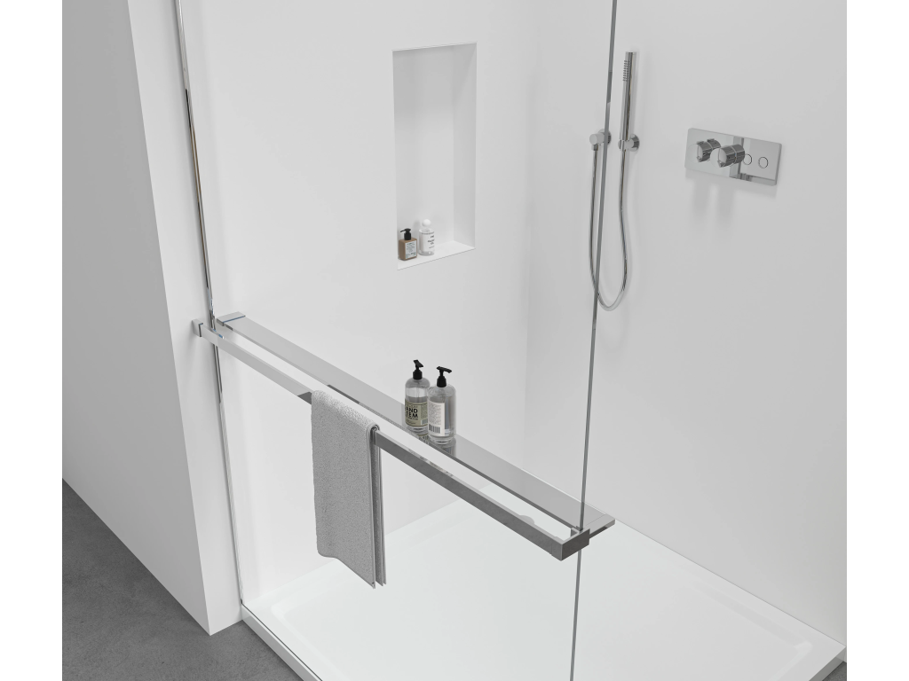 Chytré řešení 2v1 pro sprchové zástěny. Z vnější strany držák na ručníky, zevnitř praktická polička na kosmetiku a drobnosti – vše hned po ruce. Vhodné pro sprchové zástěny s maximální tloušťkou skla 8 mm. Nastavitelná šířka od 30 do 160 cm podle typu zástěny. Úspora místa, moderní vzhled a praktické využití v jednom.