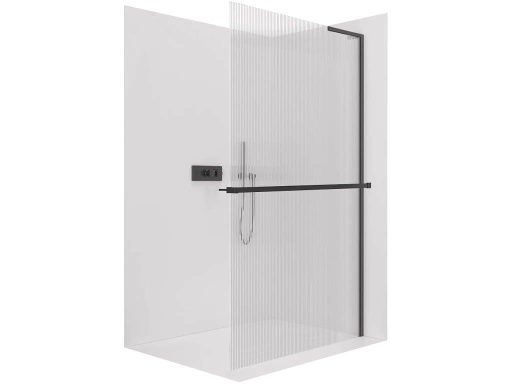CERANO - Sprchová zástěna Walk-in Onyx L-pravá vzpěra - 8 mm + polička/držák na ručníky - černá matná, rýhované sklo - 110x200 cm