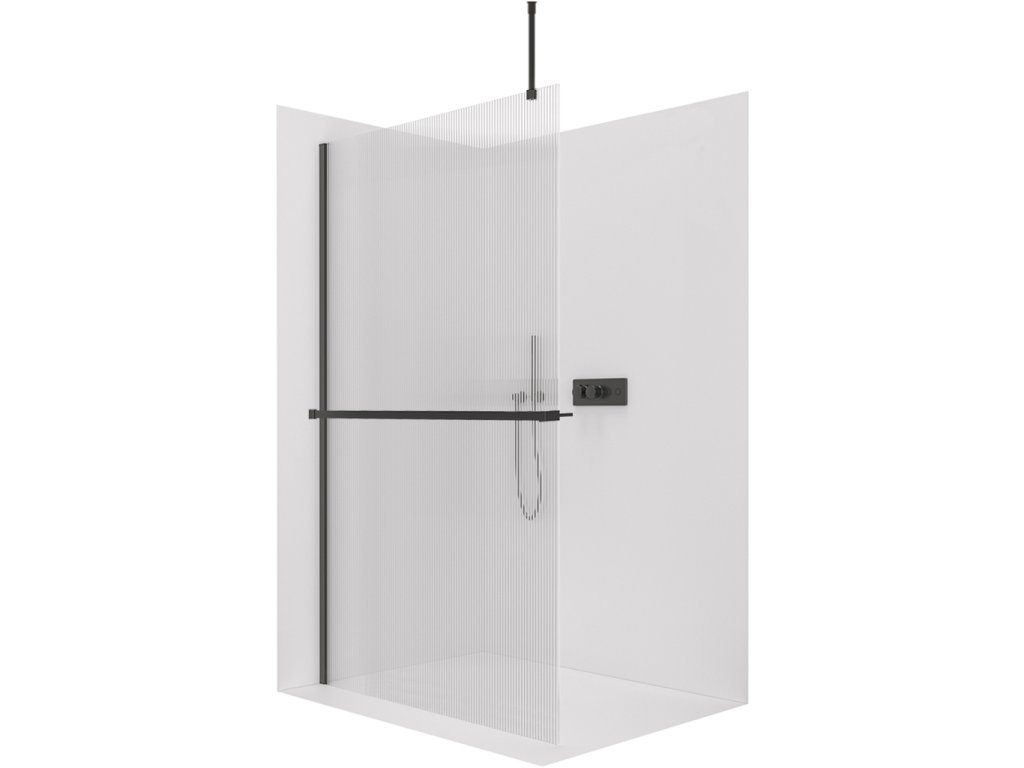 CERANO - Sprchová zástěna Walk-in Onyx Top Round L/P - 8 mm - kulatá vzpěra + polička/držák na ručníky - černá matná, rýhované sklo - 140x200 cm