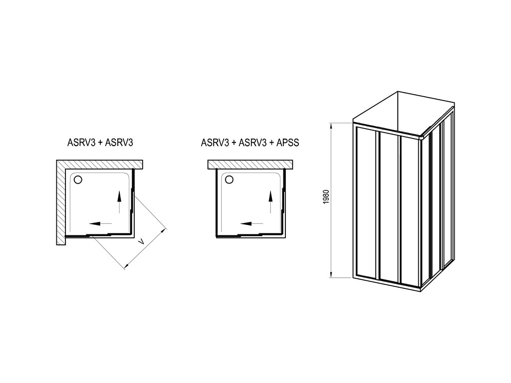 K vytvoření celého koutu jsou zapotřebí dva kusy posuvných dveří ASRV3, rohový spoj je součástí každého balení. Kombinací různých rozměrů obou dílů získáme čtvercovou nebo obdélníkovou variantu koutu (např. 75 x 90 cm, 80 x 90 cm atd.). Výrobek dodáváme ve smontovaném stavu, stačí přišroubovat ke zdi a utěsnit. Montáž výrobku zvládne jeden člověk za pouhou hodinu. Montuje se do obloženého rohu koupelny na vaničky RAVAK Aneta, Angela, Perseus, Perseus Pro, Perseus Pro Flat, Perseus Pro Chrome, Perseus Pro 10° nebo přímo na podlahu se zabudovaných odtokovým žlabem či podlahovou vpustí. Sprchový kout je možno přizpůsobit případným nepřesnostem stavebního otvoru pomocí nastavovacích profilů ANPS.