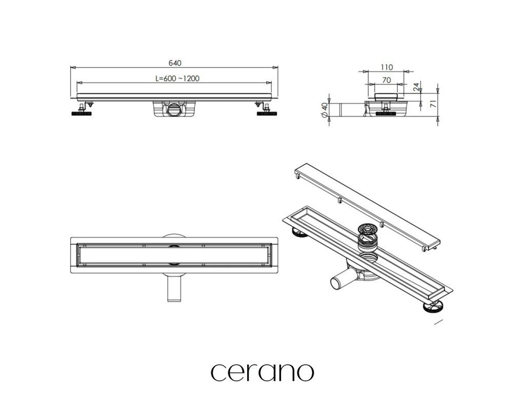 CERANO - Sprchový odtokový žlab, sifon otočný 360° - design 2v1 - nerez - DN40 - černá matná - 64 cm