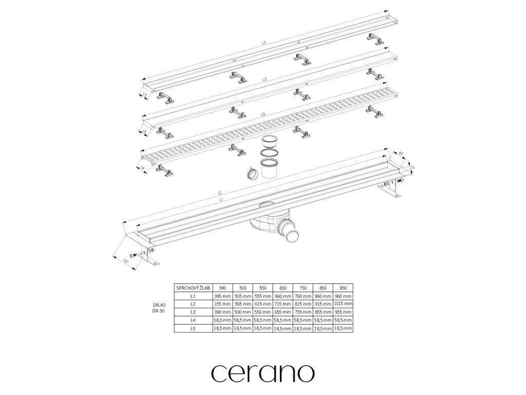 CERANO - Sprchový odtokový žlab, sifon otočný 360° - DN50 - nerez - 92 cm