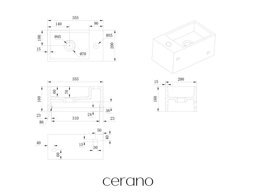 CERANO - Umývátko z litého mramoru Filo, závěsné pravé - bílá matná - 35,5x20 cm