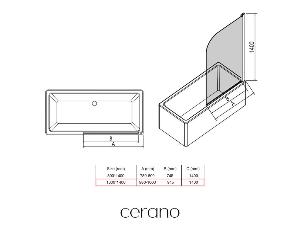 CERANO - Vanová zástěna jednodílná Chiara L/P - chrom/transparentní sklo - 100x140 cm - otočná