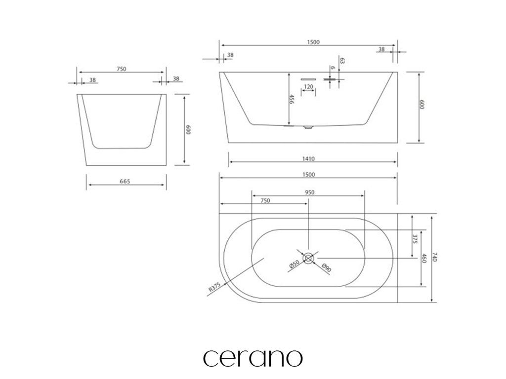 CERANO - Volně stojící akrylátová vana Bianco, pravá - černá matná/bílá lesklá - 150x74 cm