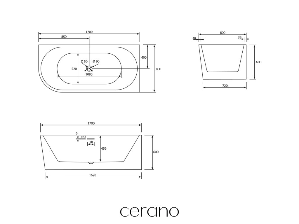 CERANO - Volně stojící akrylátová vana Bianco, pravá - černá matná/bílá lesklá - 170x80 cm