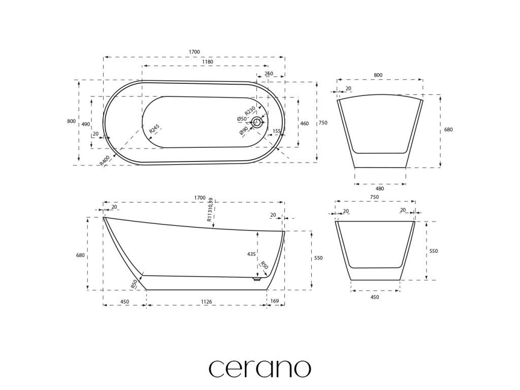 CERANO - Volně stojící akrylátová vana Savoia - bílá matná - 170x80 cm